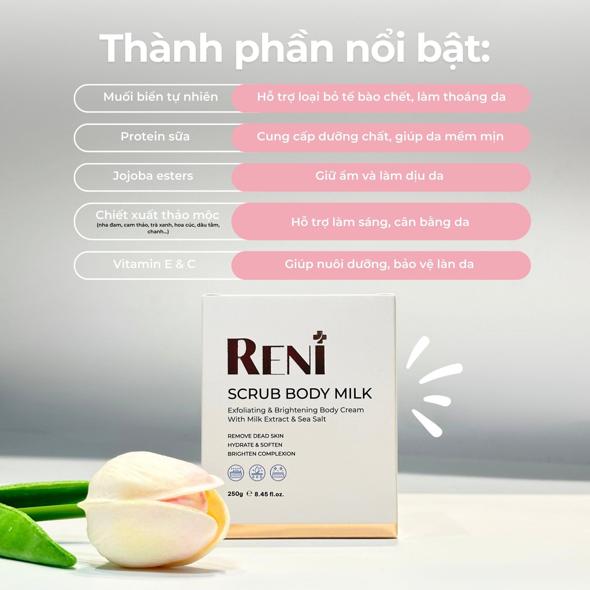 Giới thiệu sản phẩm:RENI Scrub Body Milk là dòng sữa tẩy tế bào chết body dịu nhẹ, kết hợp công nghệ làm sạch kép. Sản phẩm chứa các hạt scrub mịn được bao bọc trong lớp sữa giàu dưỡng chất, giúp làm sạch bề mặt da mà vẫn duy trì độ mềm mượt, ẩm mịn sau khi sử dụng.