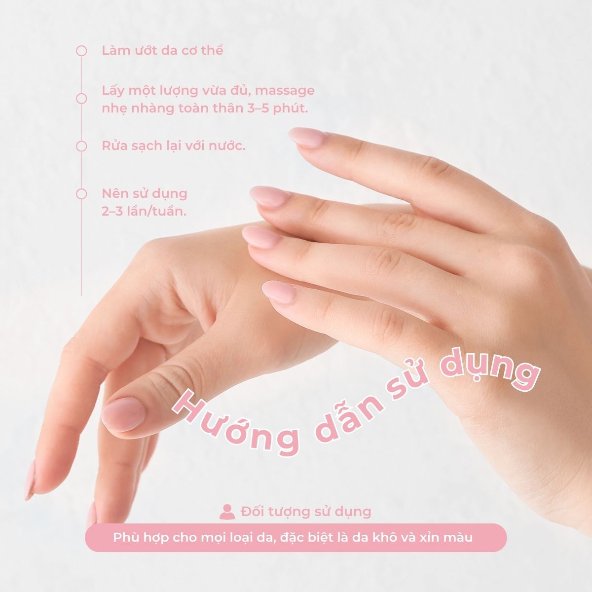 Lấy một lượng vừa đủ, massage nhẹ nhàng toàn thân 3–5 phút.